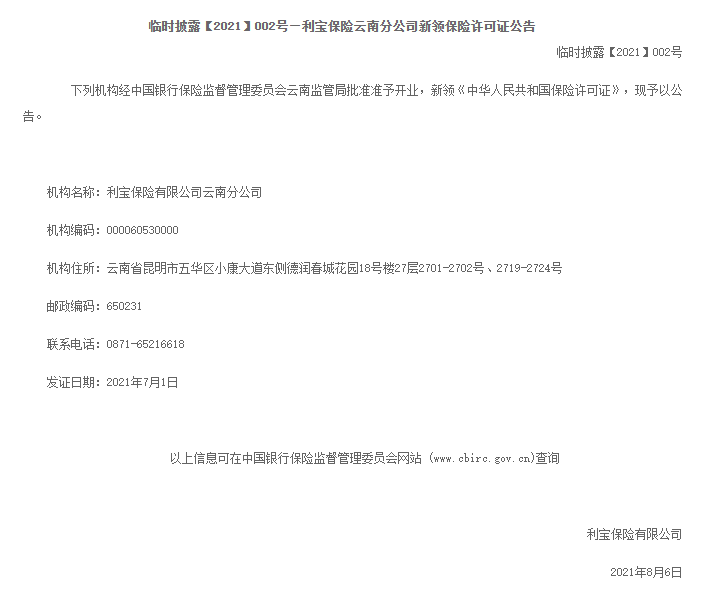 臨時披露【2021】002號—利寶保險云南分公司新領(lǐng)保險許可證公告